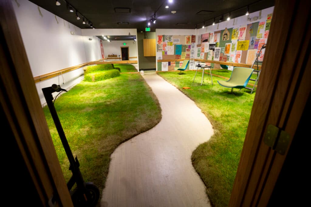 Two former pilates studios were transformed for the Biennial, too. One became a “liberation movement space,” and another into a reading room. The reading room is full of grass installed by artists, and according to DiRenzo, it’s meant to be a reflection space.