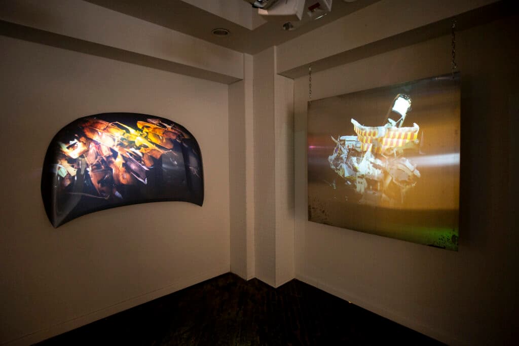 The installation includes art projected onto car doors, walls and seemingly into midair.