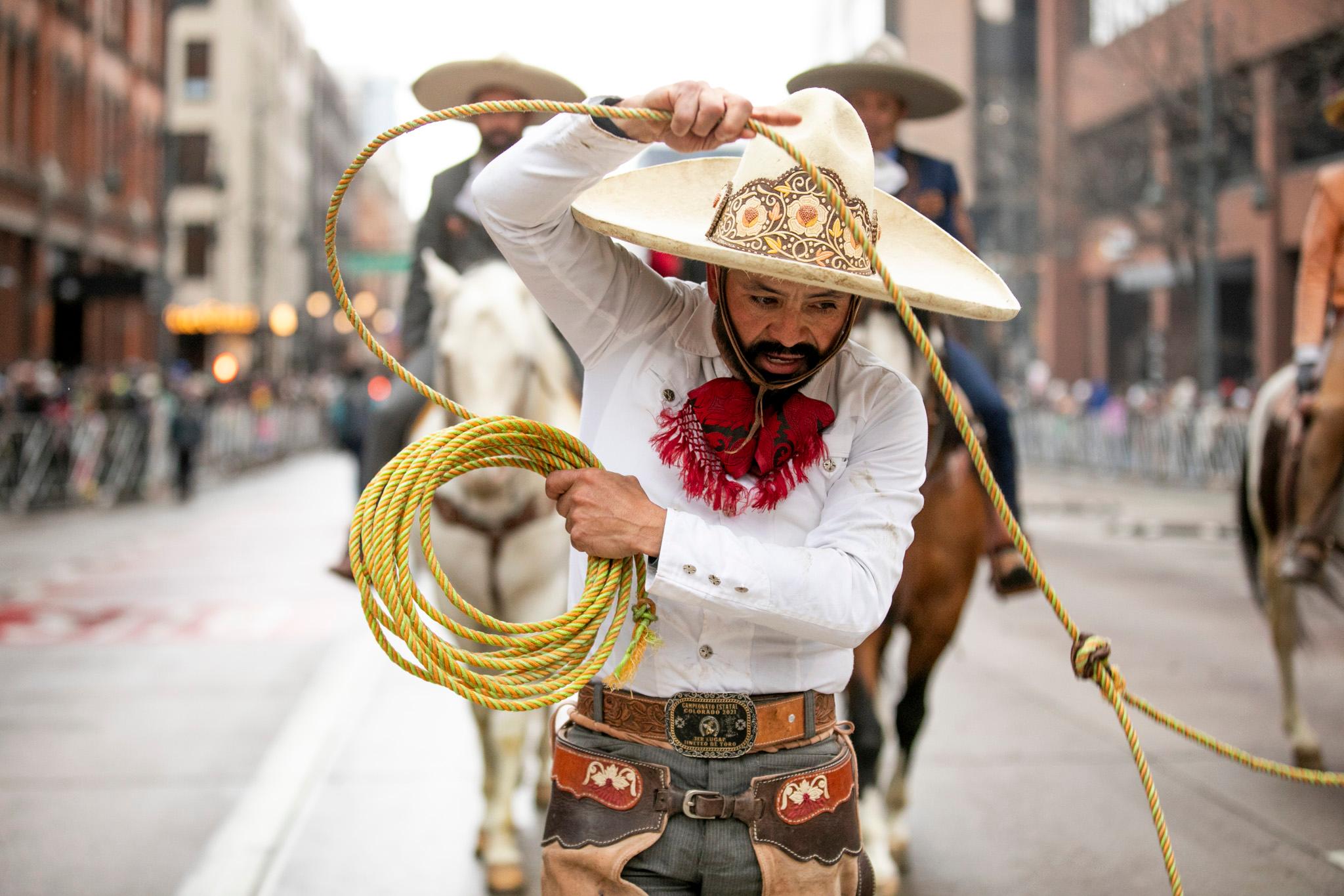Marco Diaz spins a lasso as he marches with 3 Margaritas in Denver's annual National Western Stock Show parade on 17th Street. Jan. 8, 2025.Kevin J. Beaty/Denverite