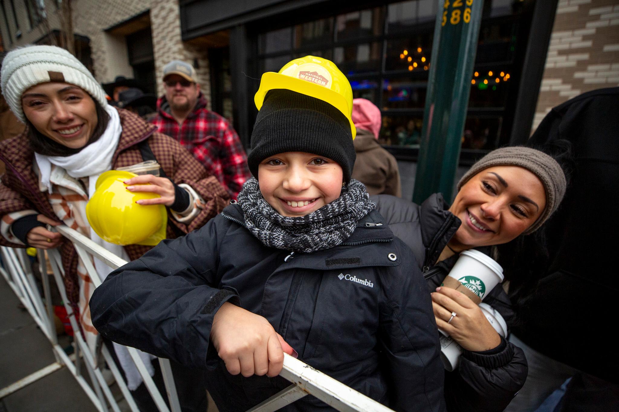Ava (10) wears a National Western Center hard hat on 17th Street during Denver's annual Stock Show parade. Jan. 8, 2025.Kevin J. Beaty/Denverite