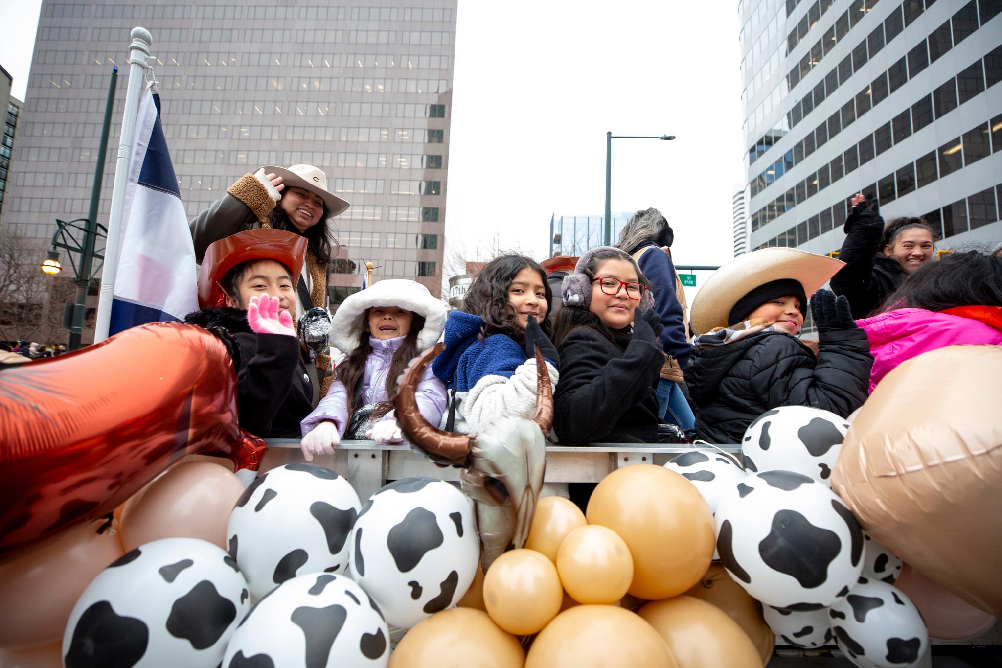Garden Place Elementary students ride in Denver's annual National Western Stock Show parade on 17th Street. Jan. 8, 2025.Kevin J. Beaty/Denverite