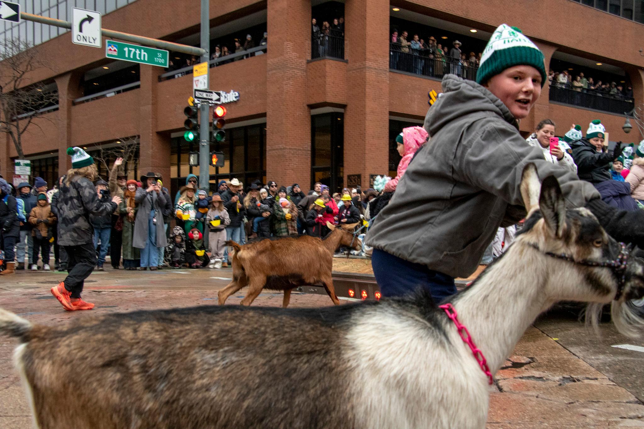 Eli (9) pulls Freya the goat down 17th Street during Denver's annual National Western Stock Show parade. Jan. 8, 2025.Sandy Battulga/CPR News