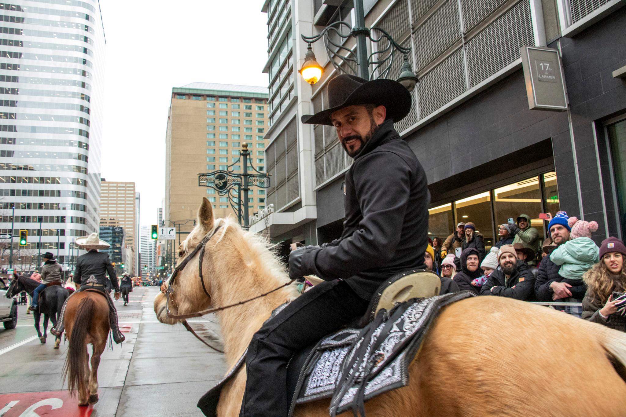 Esli Loya rides for 3 Margaritas in Denver's annual National Western Stock Show parade on 17th Street. Jan. 8, 2025.Sandy Battulga/CPR News