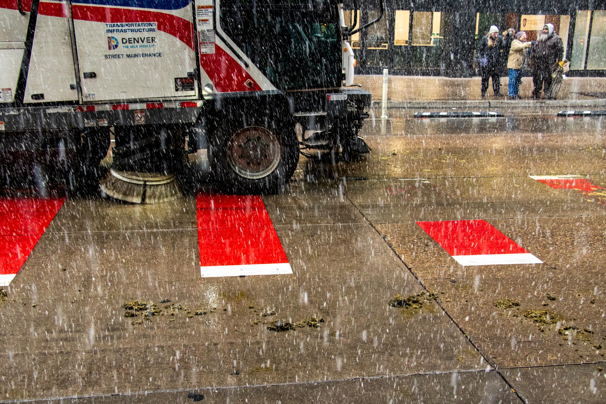 A street sweeper cleans up horse detrius after Denver's annual National Western Stock Show parade concluded on 17th Street. Jan. 8, 2025.Sandy Battulga/CPR News