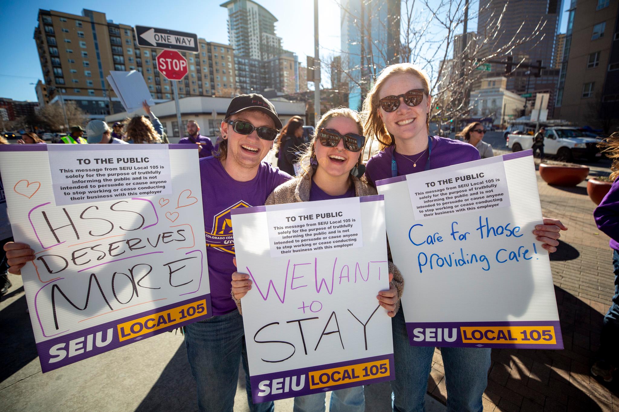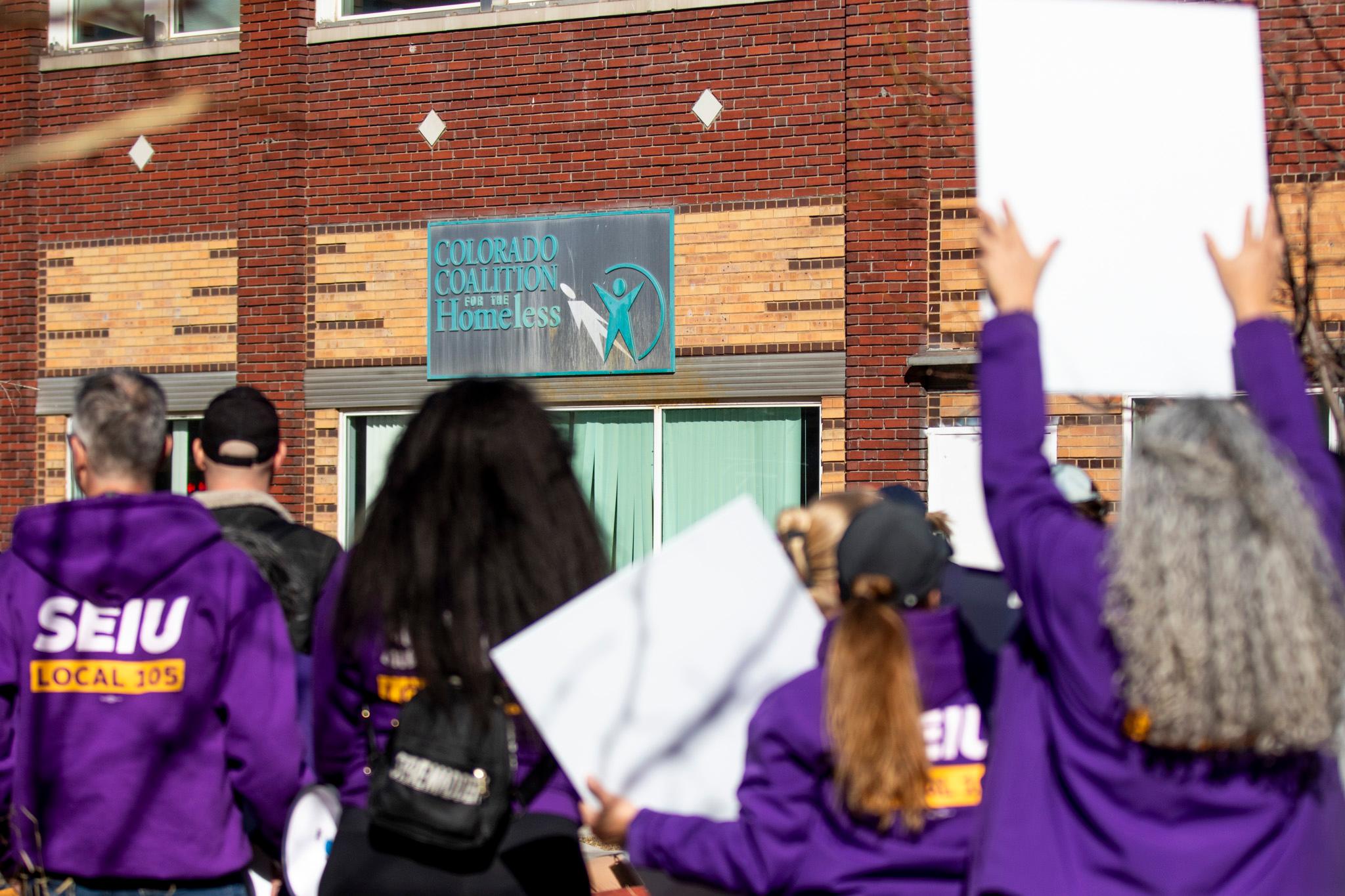 These are some of the complaints Colorado Coalition for the Homeless frontline workers who have unionized with SEIU Local 105 raised at a lunchtime demonstration in front of the nonprofit’s headquarters on Thursday.