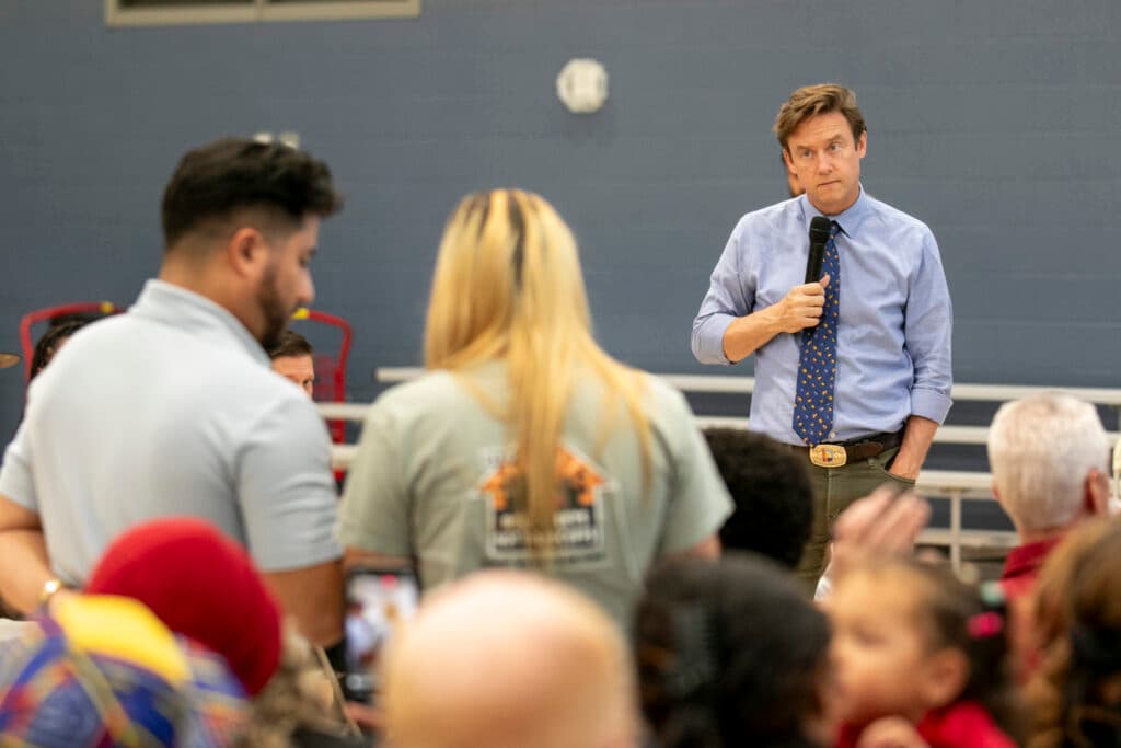 Mayor Mike Johnston listens as housing advocate V Reeves speaks about the need for more family shelters, during a public meeting at the Central Park Recreation Center on Johnston's evolving solutions to homelessness. Sept. 25, 2025. Kevin J. Beaty/Denverite