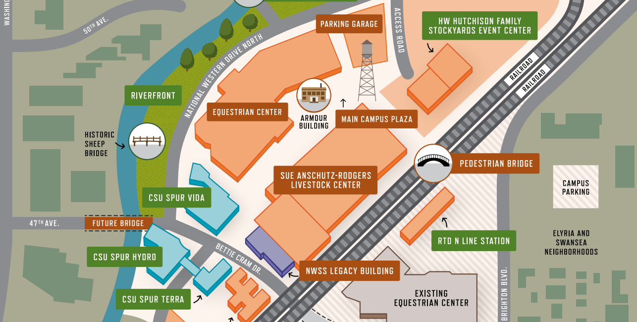 The 250-foot pedestrian bridge will connect the east and west parts of the campus near the N Line Station at 48th and Brighton, crossing nine railroad tracks near the Stockyards Event Center.
