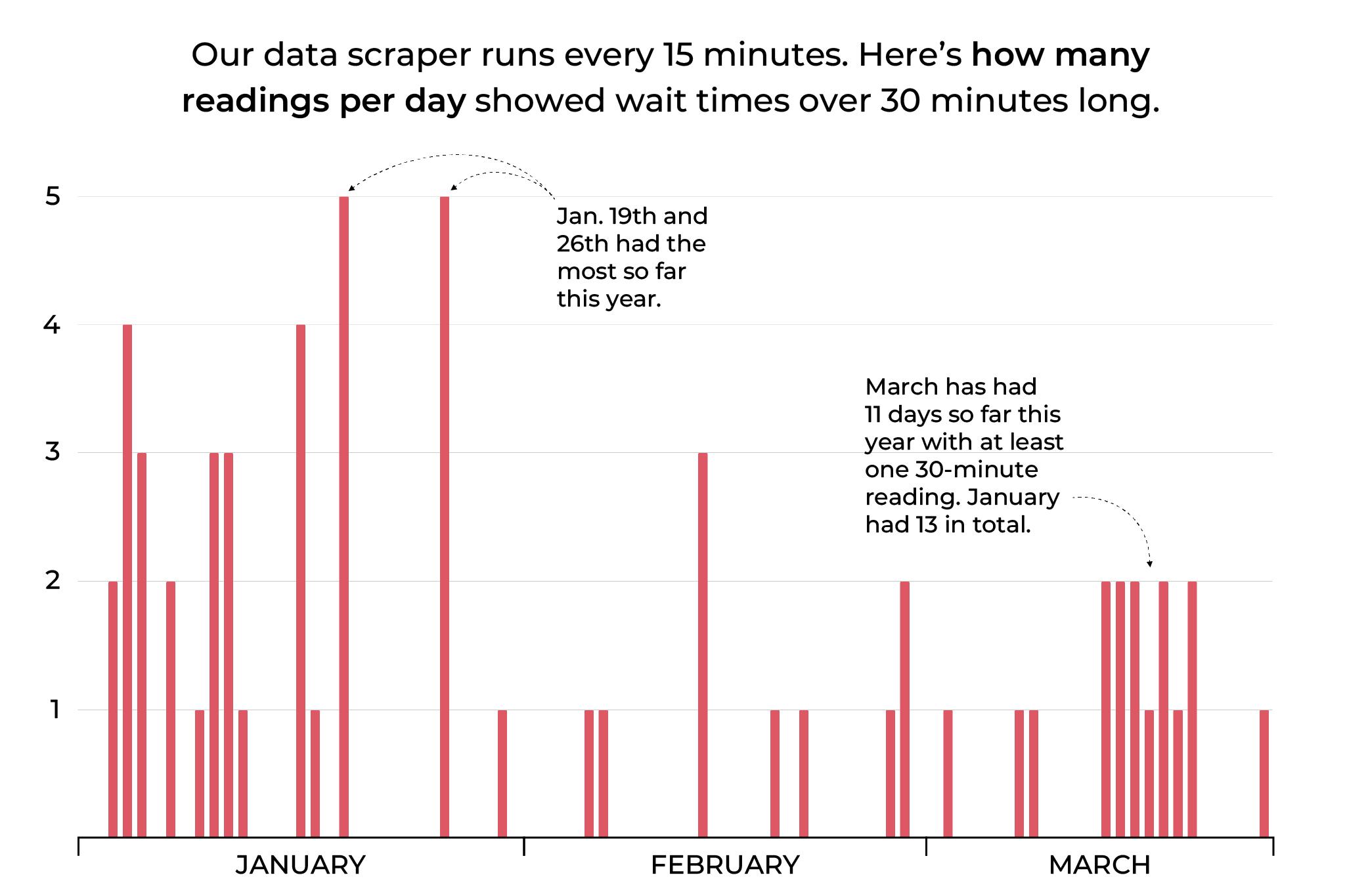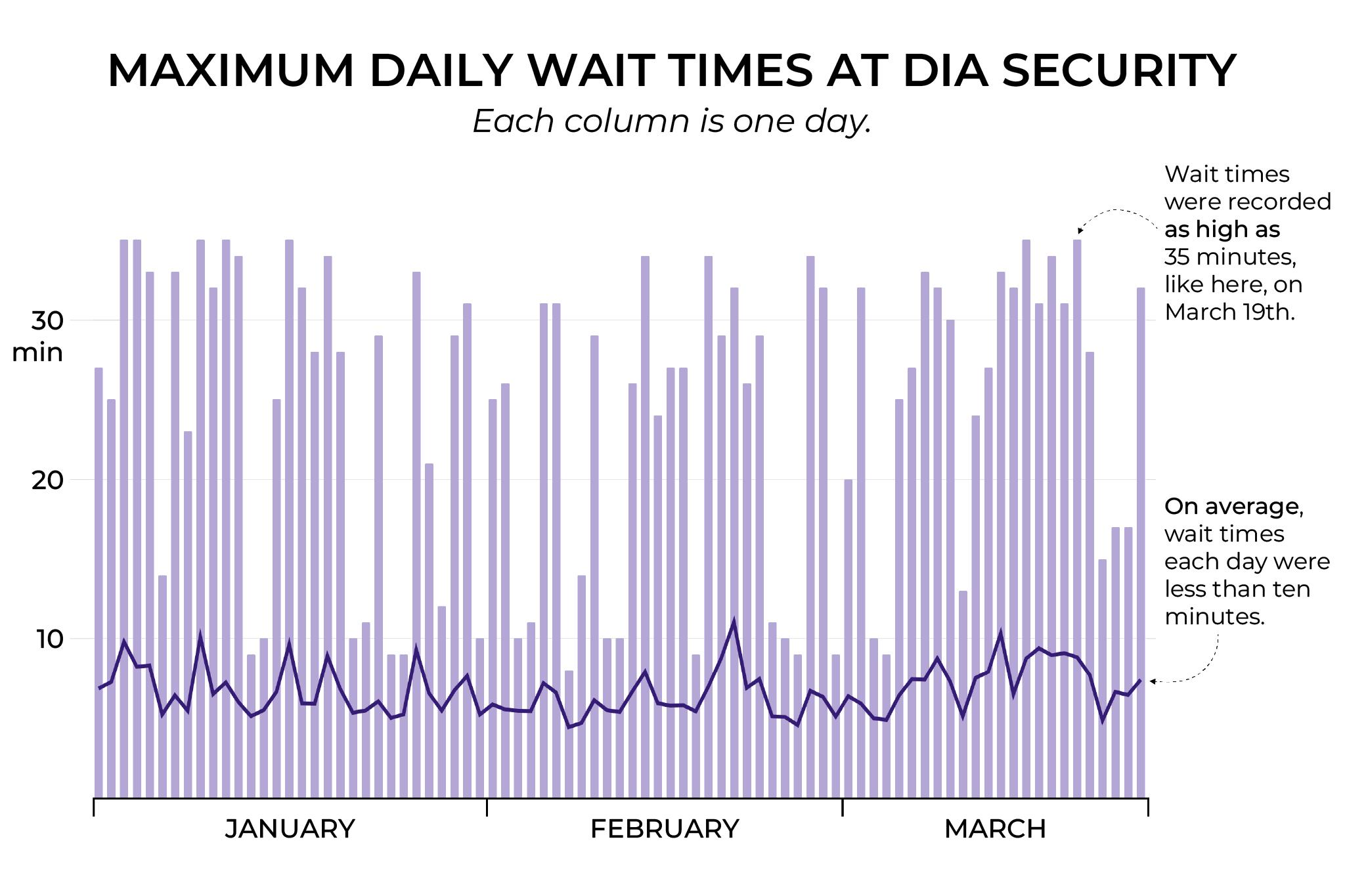Denverite has been tracking TSA wait times by monitoring the airport’s website. Wait times haven’t exceeded 35 minutes since Feb. 14, when the partial government shutdown began. That’s in line with what we saw in prior months.